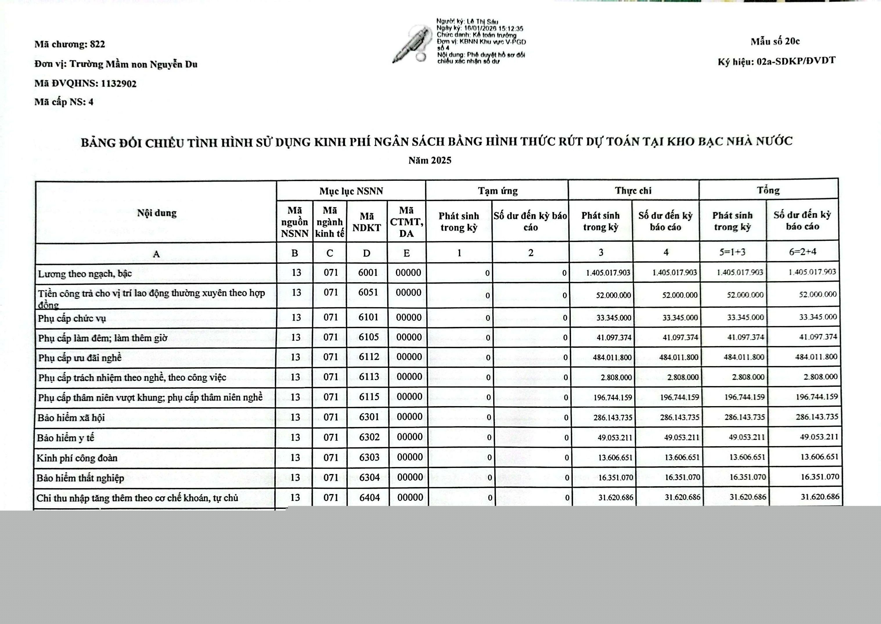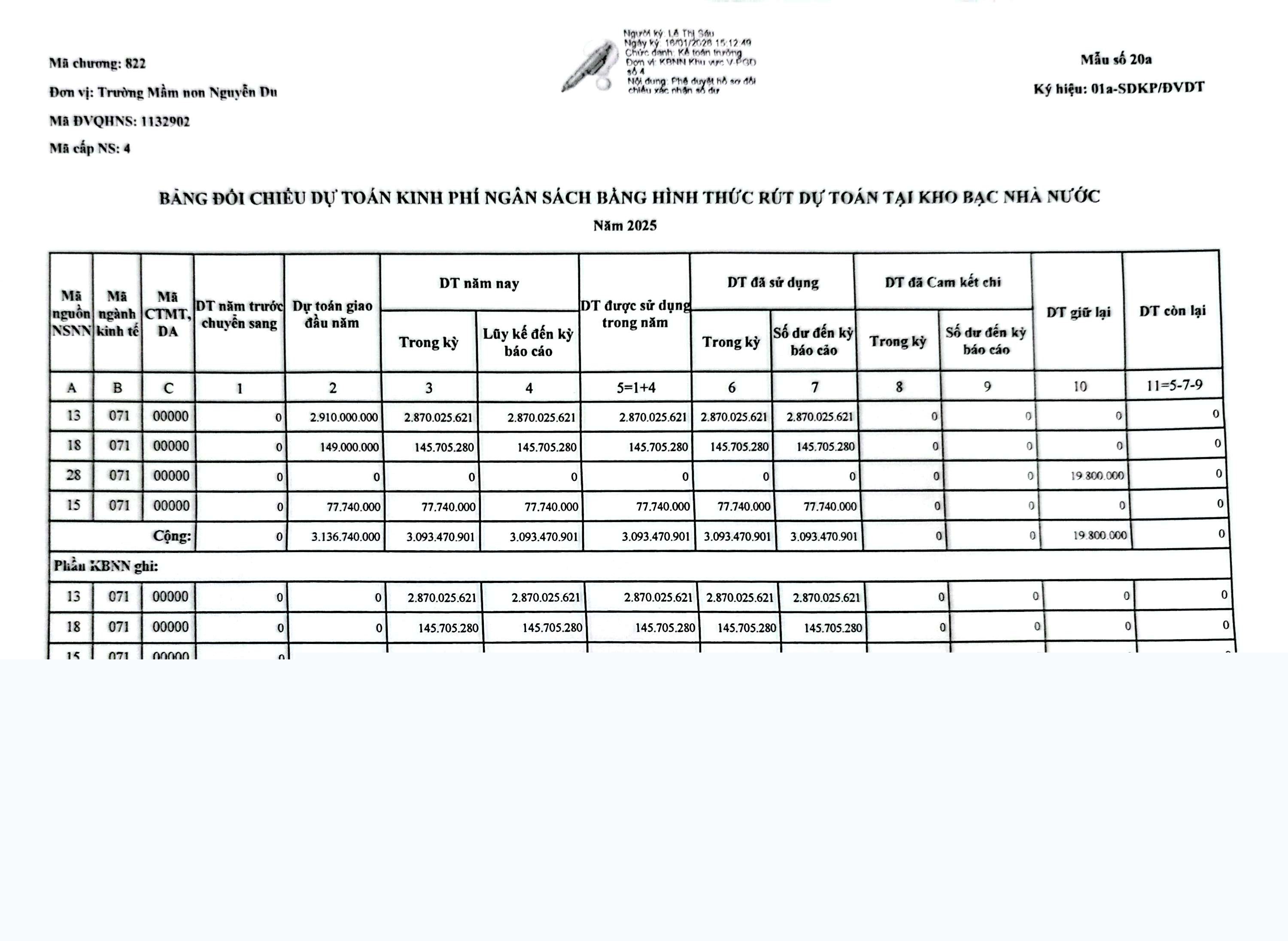 Trường MN Nguyễn Du- Công khai bảng đối chiếu tình hình sử dụng kinh phí ngân sách bằng hình thức rút dự toán tại kho bạc nhà nước năm 2025